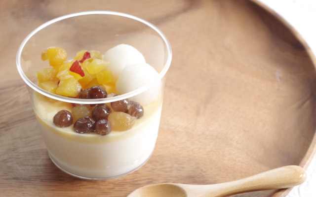 かき混ぜることで濃厚なココナツブランマンジェにまろやかさが加わり、トッピングを引き立てます。